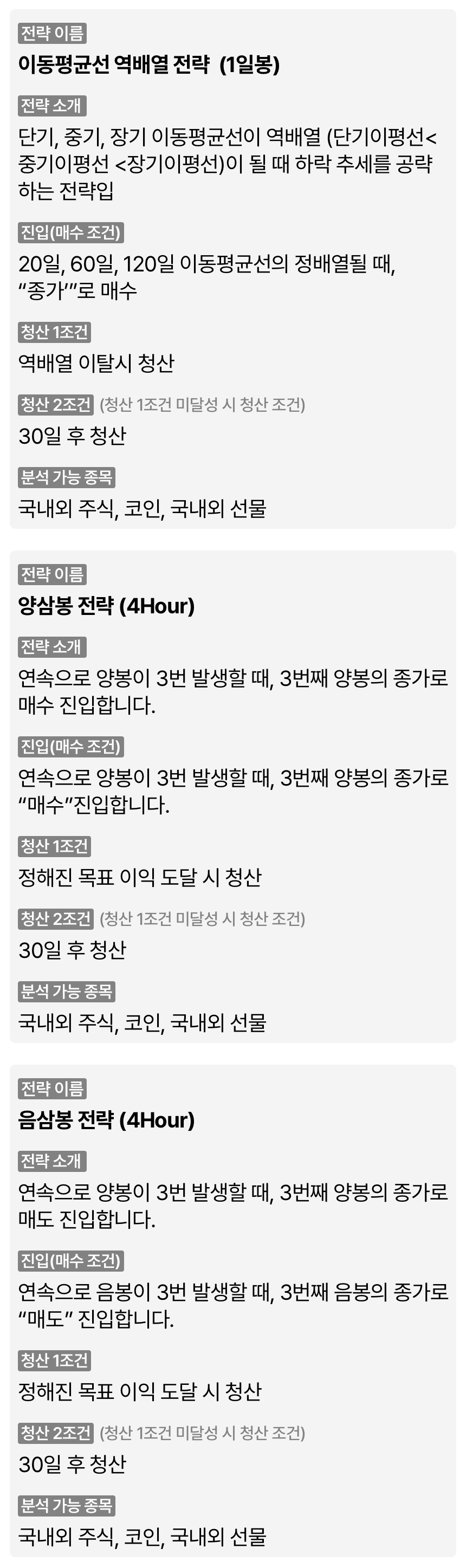 아래의 "무료 분석 가능 전략 템플릿" 의 전략과 종목을 1개씩 지정하여 무료 분석을 받아보세요.국내외 어떤 주식 종목이든 가능합니다.